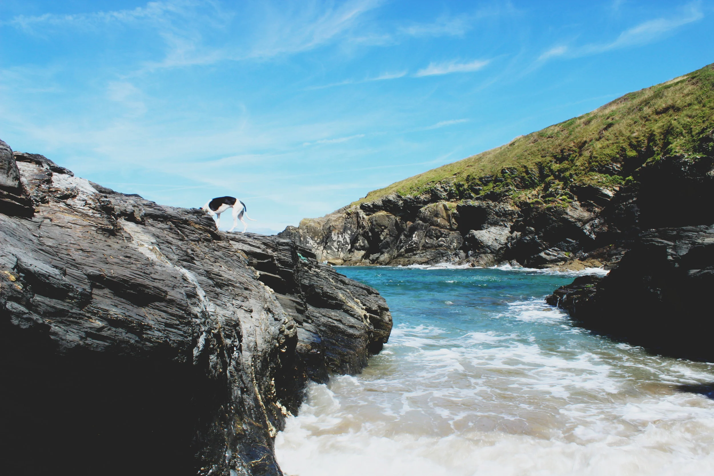 A short journey out of Port Isaac took us to Lundy Bay. This place is so tucked away we drove straight past it before noticing a small National Trust sign pointing in the opposite direction. A 15 minute walk through a small wooded area full of butterflies and other wildlife led us to the secluded Lundy Cove. Wasting no time we were straight in the sea, enjoying the clear blue waters for ourselves. It seemed Dogs also loved it here. We watched one in particular that kept diving in from the rocks. This is also where the body board got its first dip. Apparently seals can usually be spotted roaming the rocks. Unfortunately we saw no such visitors, but this just means we have an excuse to go back right? Lundy Bay was probably my favourite place of the whole trip. This was mainly because it was a hidden gem. Only a few people were here and we basically had the whole place to ourselves.